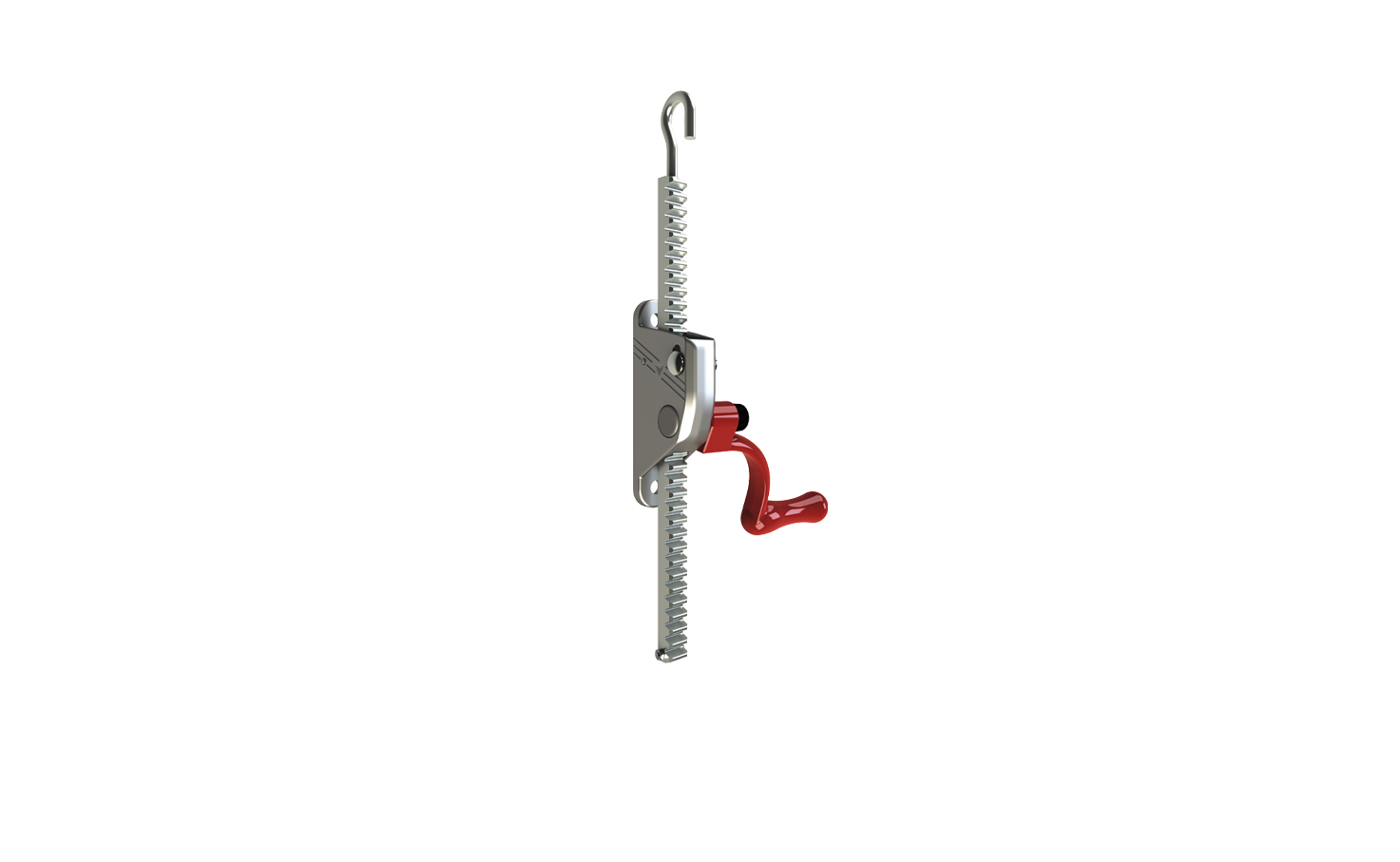 That Metalu Plast accessory is made up of a rack in raw steel, body and fixation in aluminium and an ergonomic crank in red plastic-coated aluminium. It is possible for you to install the crank on the left of the body. That pinion jack is extremely secured thanks to the lifting buttons, avoiding the risk of getting fingers caught.